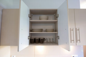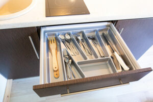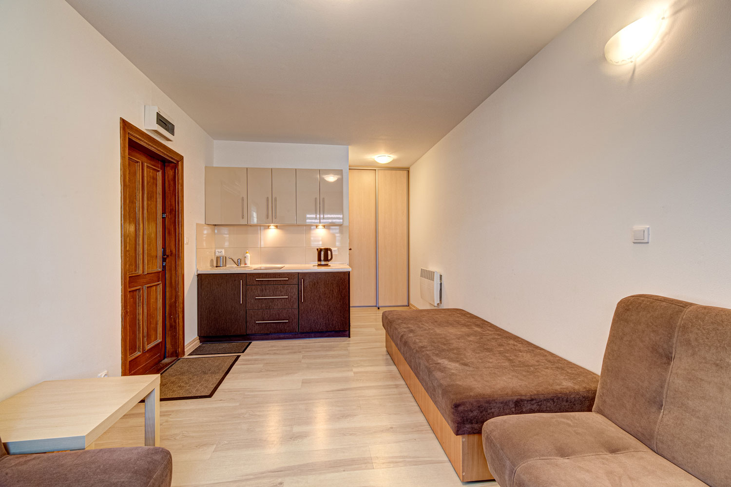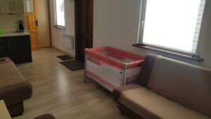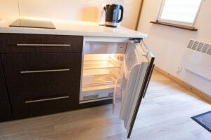 lodówka, kuchenka elektryczna, czajnik oraz komplet naczyń i sztućców dla 6 osób.